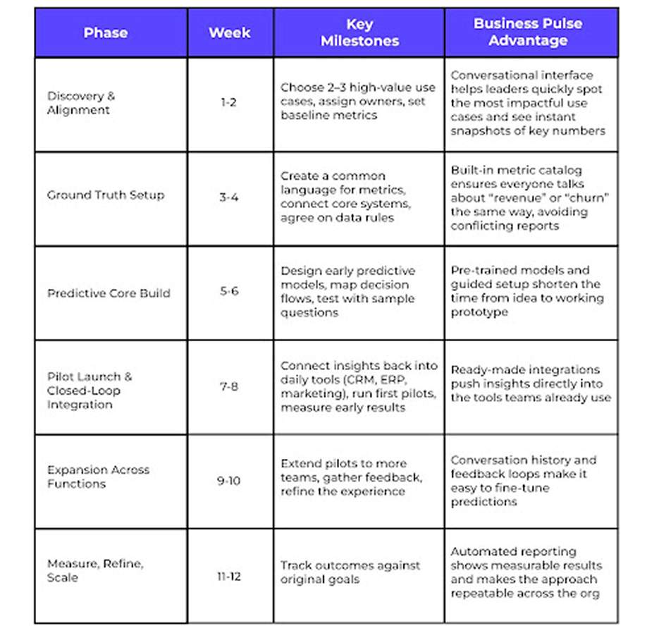 This 90-day blueprint gives you a practical, step-by-step playbook to move from static reports to predictive insights that guide real decisions. By following this plan, you’ll go from identifying 2–3 high-value predictive use cases to running live pilots, measuring outcomes, and building a repeatable playbook your teams can scale across the enterprise. With predictive analytics for leaders integrated into every step, you’re not just analyzing data you’re building a culture of foresight.