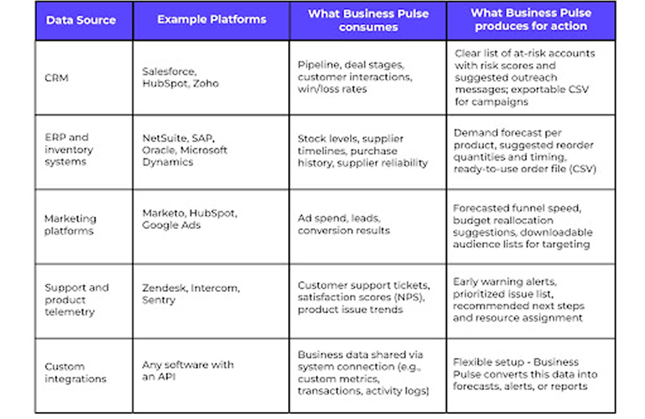 Business Pulse connects to data in two main ways. First, it connects to systems via native connectors and APIs. Common integrations include CRM platforms like Salesforce, HubSpot, and Microsoft Dynamics; ERP systems such as NetSuite, SAP, and Microsoft Dynamics 365; marketing platforms including Marketo, HubSpot Marketing, Google Ads, and Facebook Ads; and support platforms like Zendesk and Intercom. Second, it can read from your central data store or warehouse, for example Snowflake, BigQuery, or Redshift, when teams centralize ETL/ELT there.