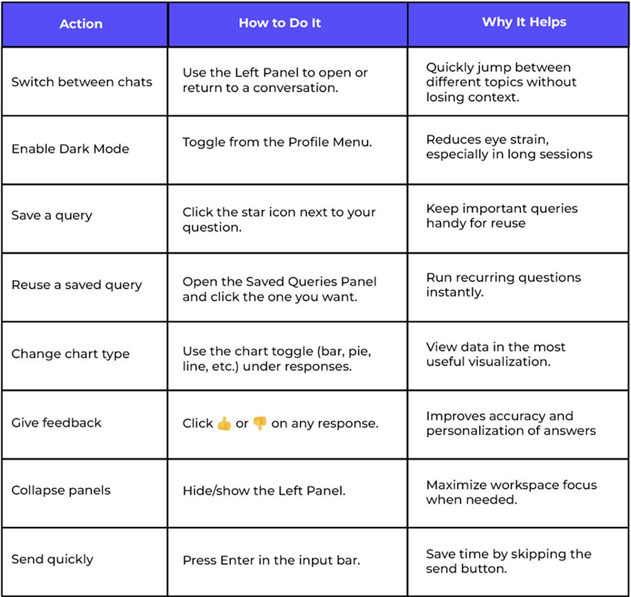 Accessing saved queries: Open the Saved Queries panel (from the star icon in the top bar or beside the chat area) to see all your saved items in one place.
